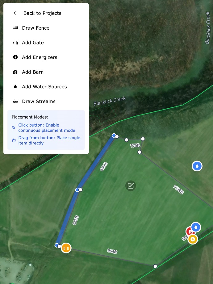 Click to trace your boundary, paddock, lane, or pasture. Add corners, curves, and property features.